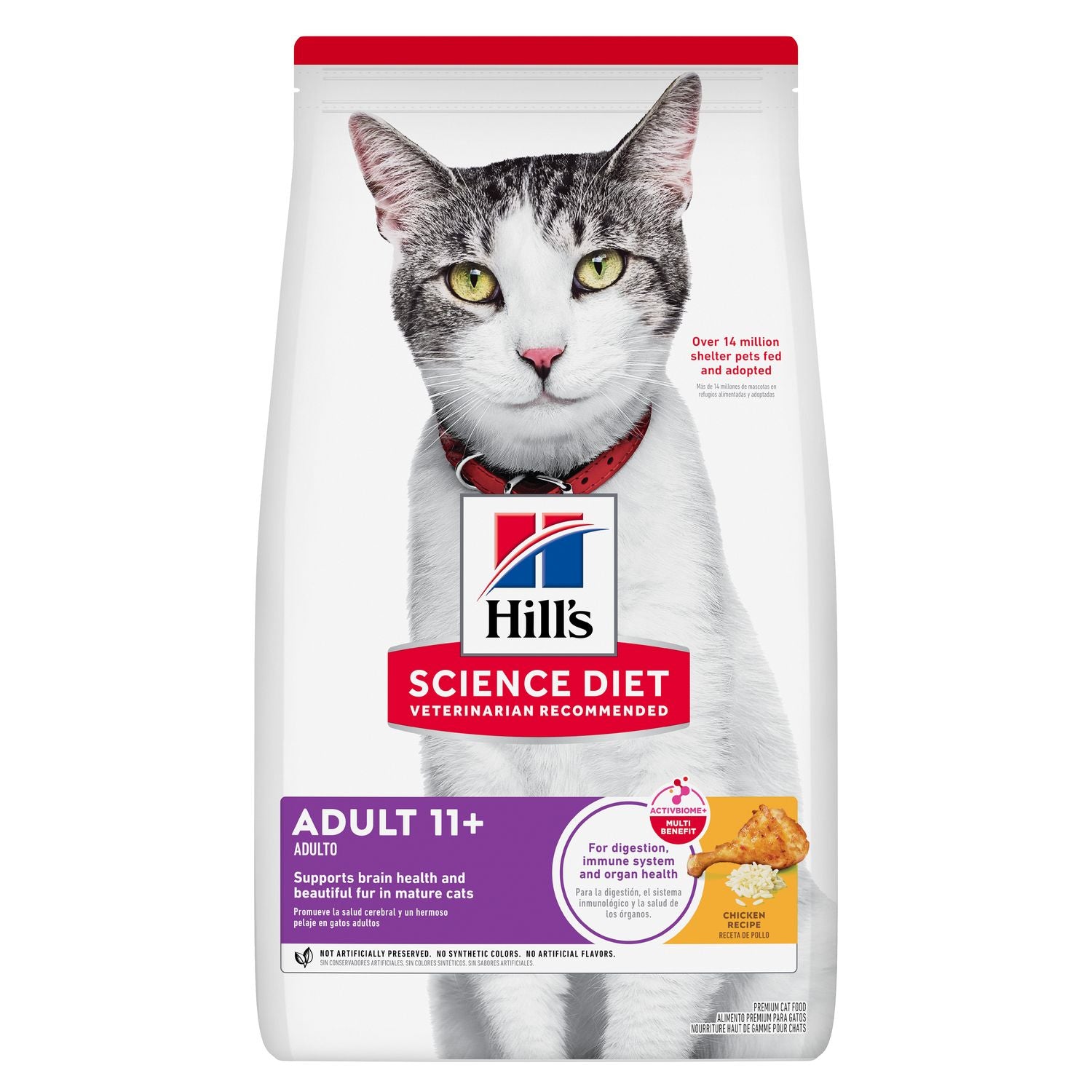 Hill’s Science Diet Adult 11+ dry cat food supports healthy aging during the golden years. Contains a special ingredient blend to help keep older cats agile, more alert & interactive.